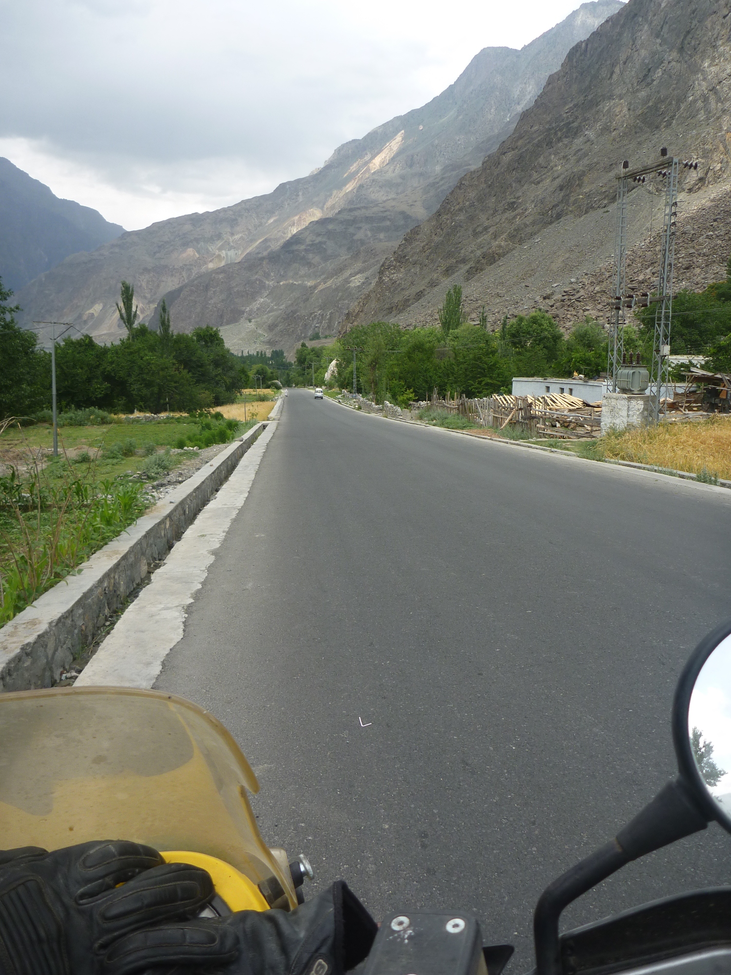 I decided to chance my luck and left. Refuelling on the way out of town, I took the scenic route up the Naltar Valley and then over the Hunza River back onto the KKH proper. The road was a joy to ride – smooth, flowing bitumen with beautiful scenery and little traffic. After about 50km, I arrived at the inevitable police checkpoint and was pleasantly surprised when, after the obligatory “Entry” in another dog-eared logbook and photo opportunity, I was wished well and sent on my way. Maybe it was my lucky day!