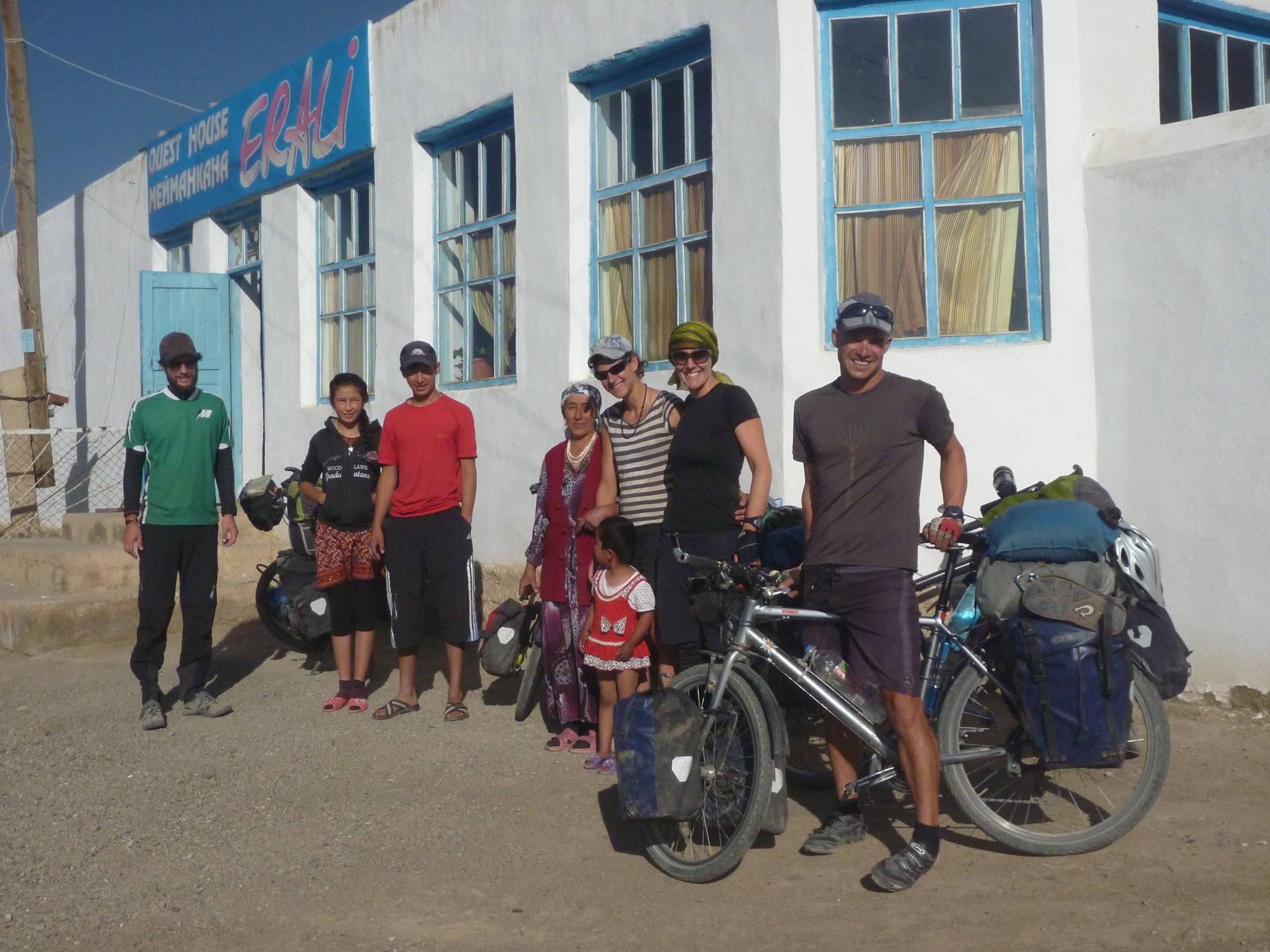 The four intrepid Swiss cyclists with Erali’s family about to leave for Sary Tash. And I thought I was doing it tough.