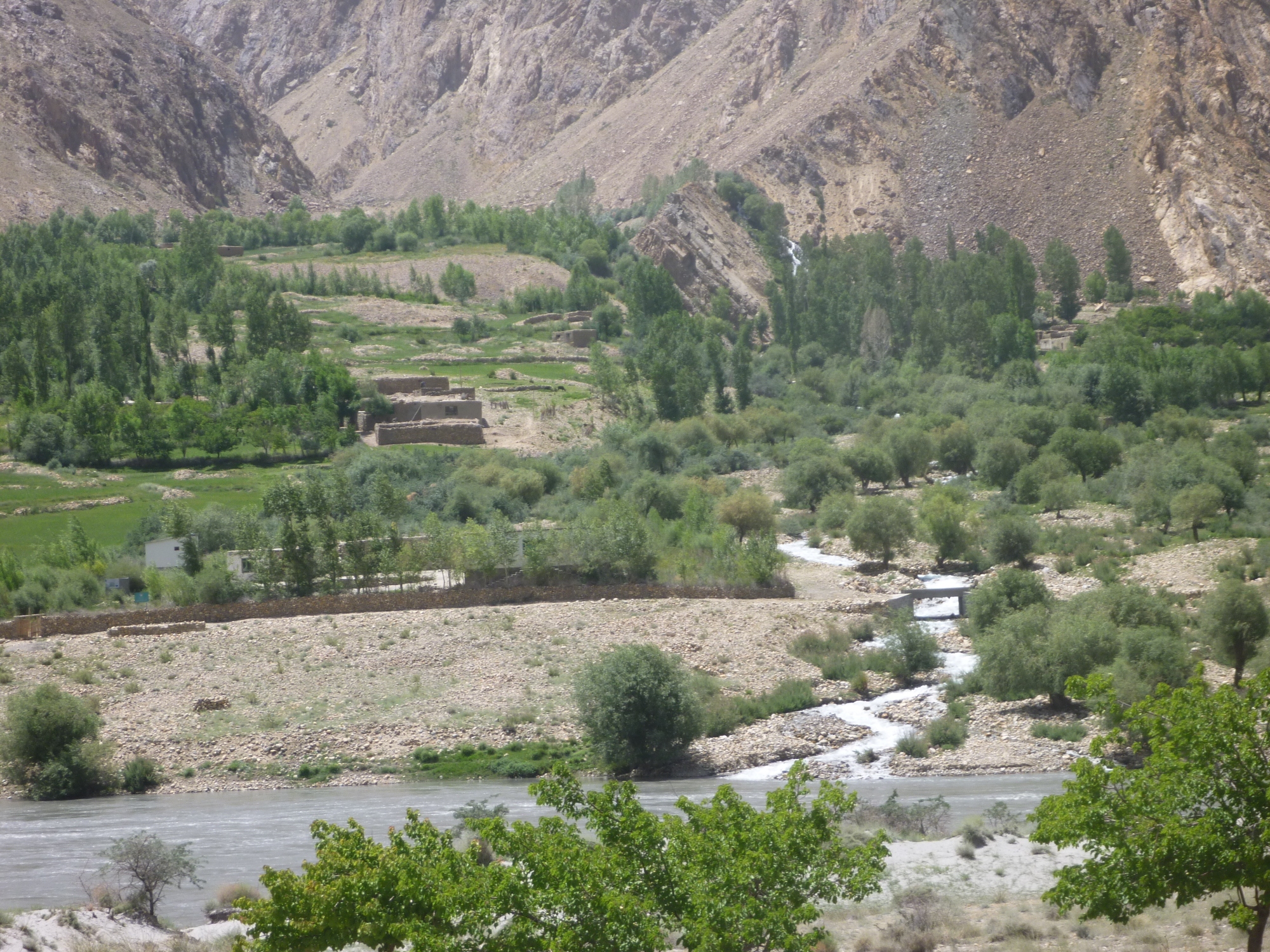 The valley was dotted with small villages with unpronounceable names like Vrang, Yamg, Zumudg or Shitkharv. Typically these villages were built along a poplar-lined main street and were home to small market gardens that flourished in the fertile stretches where the valley opened up and the river slowed to a more gentle pace. Just 100m away, on the opposite bank of the Pyanj, many small Afghan villages were clearly visible all along the Wakhan Highway.