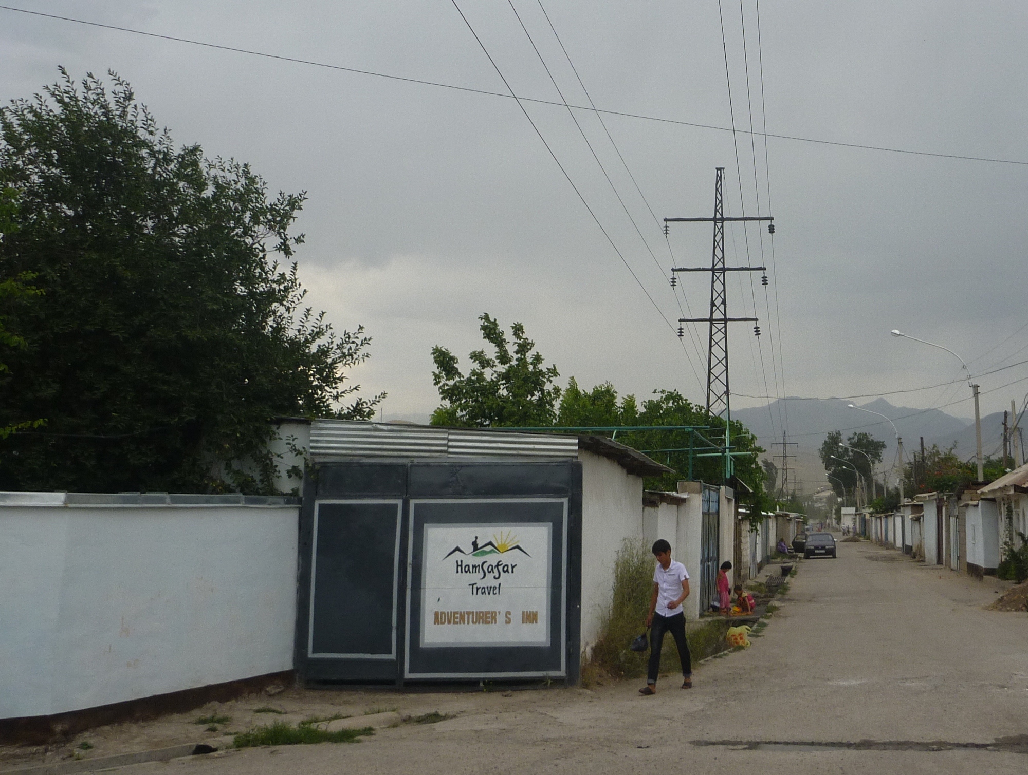I had a good idea of the general area where the guesthouse was (behind Varzob bazaar) but even several locals in the area didn’t recognise the street address. I was about to give up and just check into one of the large hotels on Rudaki, the main street of Dushanbe, but I decided to have one last search.  I relied on my own sense of direction and went down an alleyway which I was sure was close to the guesthouse. I reached a dead-end without any sign of the guesthouse. By now the frustrations of the day were starting  to take their toll. I would have to do a U-turn in the narrow dead-end and start searching again. As I did the U-turn, there in front of me was the sign for the guesthouse, The Adventurer’s Inn. Approaching from the side street at the far end the sign was invisible.